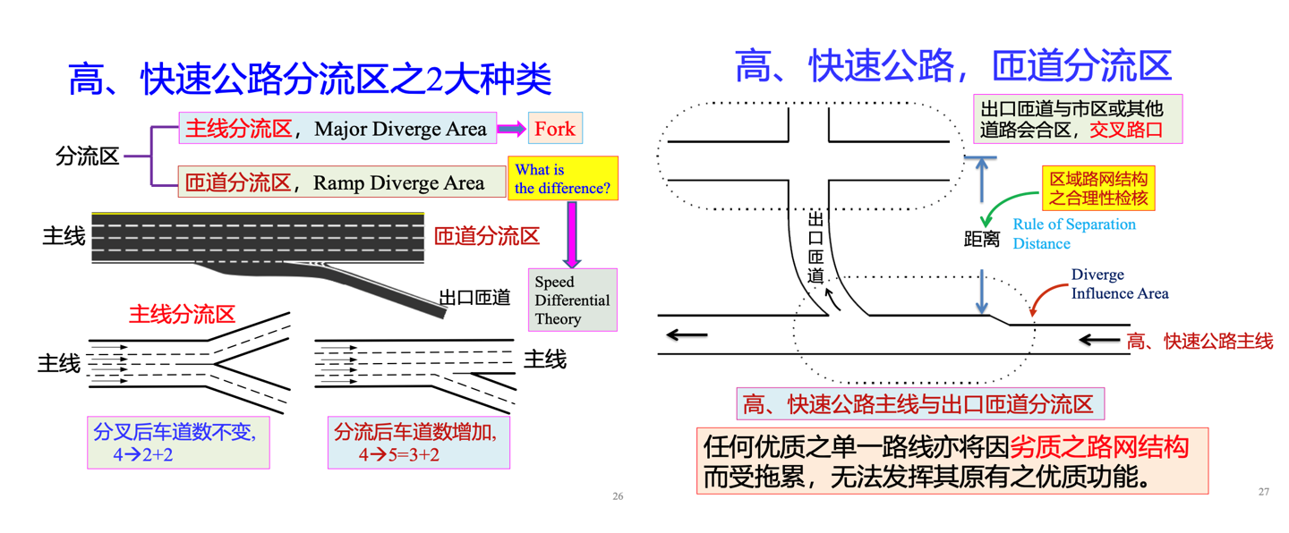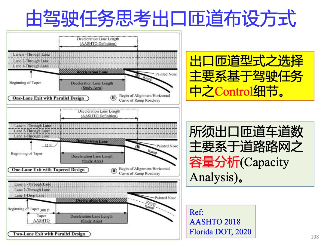 由驾驶任务思考出口匝道的布设方式,出口匝道型式的选择主要基于驾驶任务中的控制细节。所须出口匝道车道数主要基于道路路网的容量分析(Capacity Analysis)(图25)。