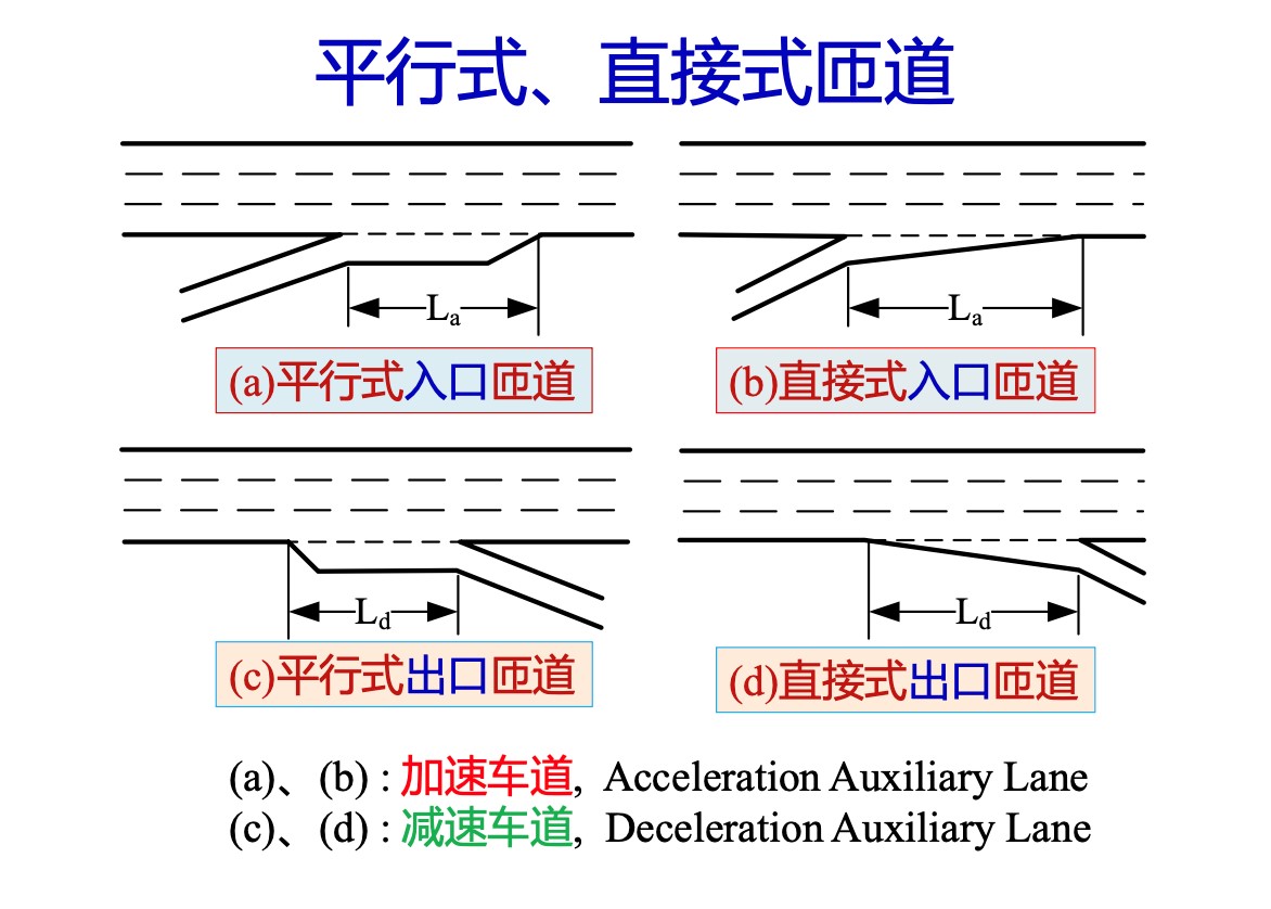 匝道类型分为平行式匝道与直接式匝道,其中平行式匝道分为平行式入口匝道和平行式出口匝道、直接式匝道分为直接式入口匝道和直接式出口匝道。入口匝道对应加速车道(Acceleration Auxiliary Lane)、出口匝道对应减速车道(Deceleration Auxiliary Lane)(图4)。