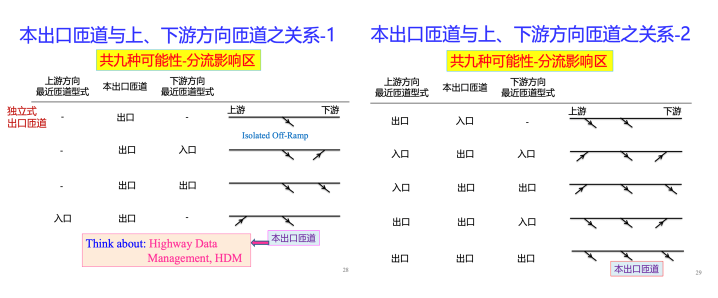 在分流影响区,一个出口匝道与上、下游方向匝道的关系共有九种可能关系,考虑利用HDM(Highway Data Management)来进行检核(图7)。