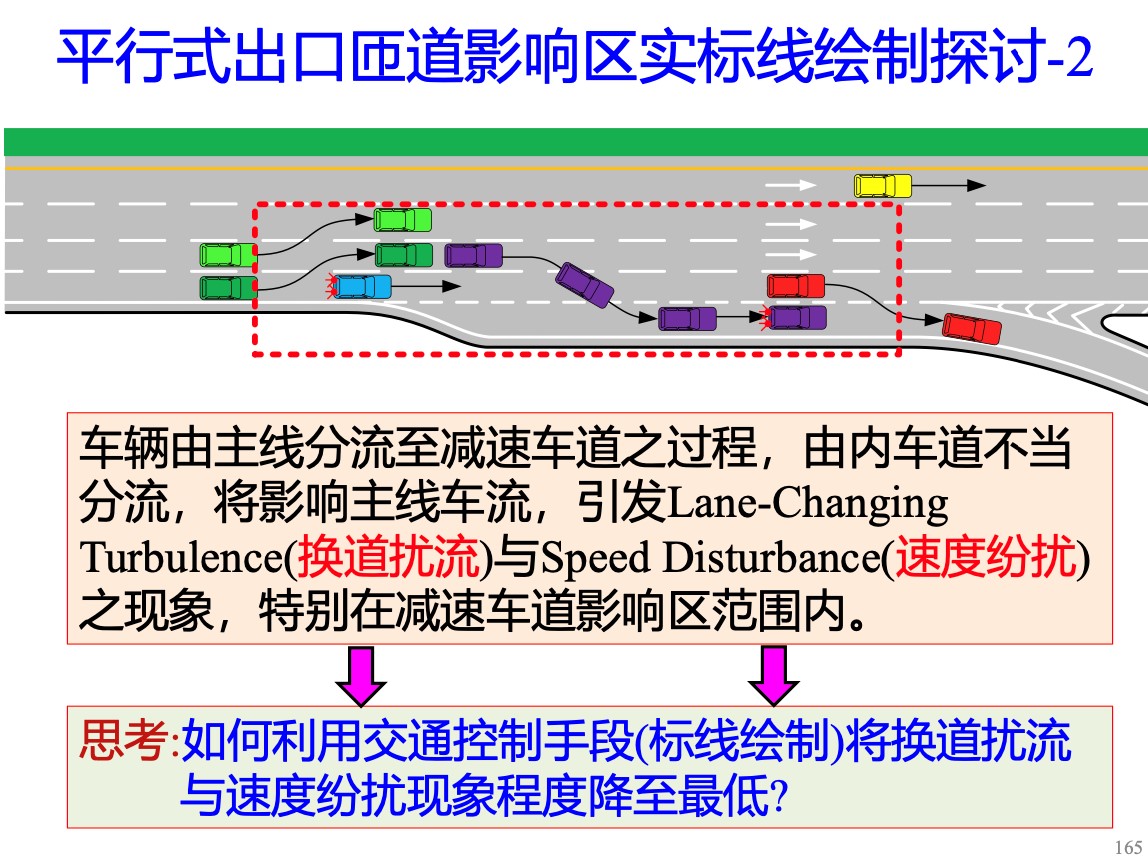 对于平行式出口匝道,车辆由主线分流至减速车道的过程中,若内车道分流不当,将影响主线车流,引发Lane-Changing Turbulence(换道扰流)与Speed Disturbance(速度纷扰)的现象,尤其在减速车道影响区范围内会对主线车流产生很大的影响(图49)。因此,应重点关注如何在出口匝道影响区利用交通控制手段(标线绘制)将换道扰流与速度纷扰现象程度降至最低。
