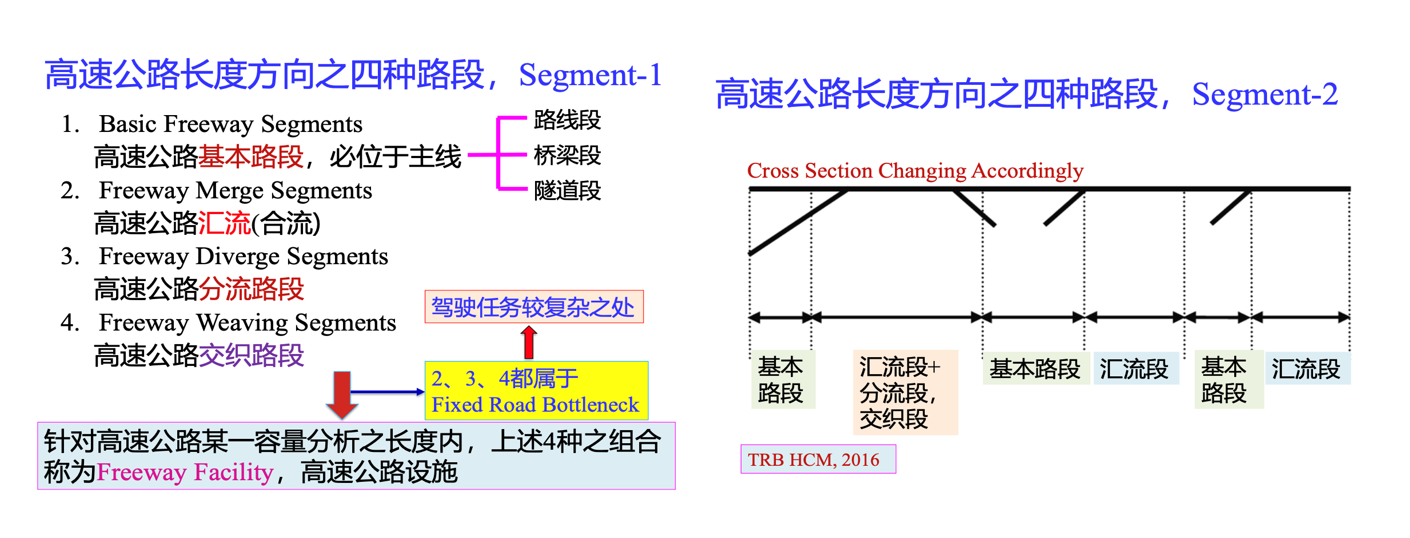 高速公路长度方向有四种路段:高速公路基本路段(Basic Freeway Segments)、高速公路汇流路段(Freeway Merge Segments)、高速公路分流路段(Freeway Diverge Segments)和高速公路交织路段(Freeway Weaving Segments)。其中,后三种均属于道路瓶颈路段。针对高速公路某一容量分析的长度内,上述4种的组合 称为高速公路设施(Freeway Facility)(图2)。