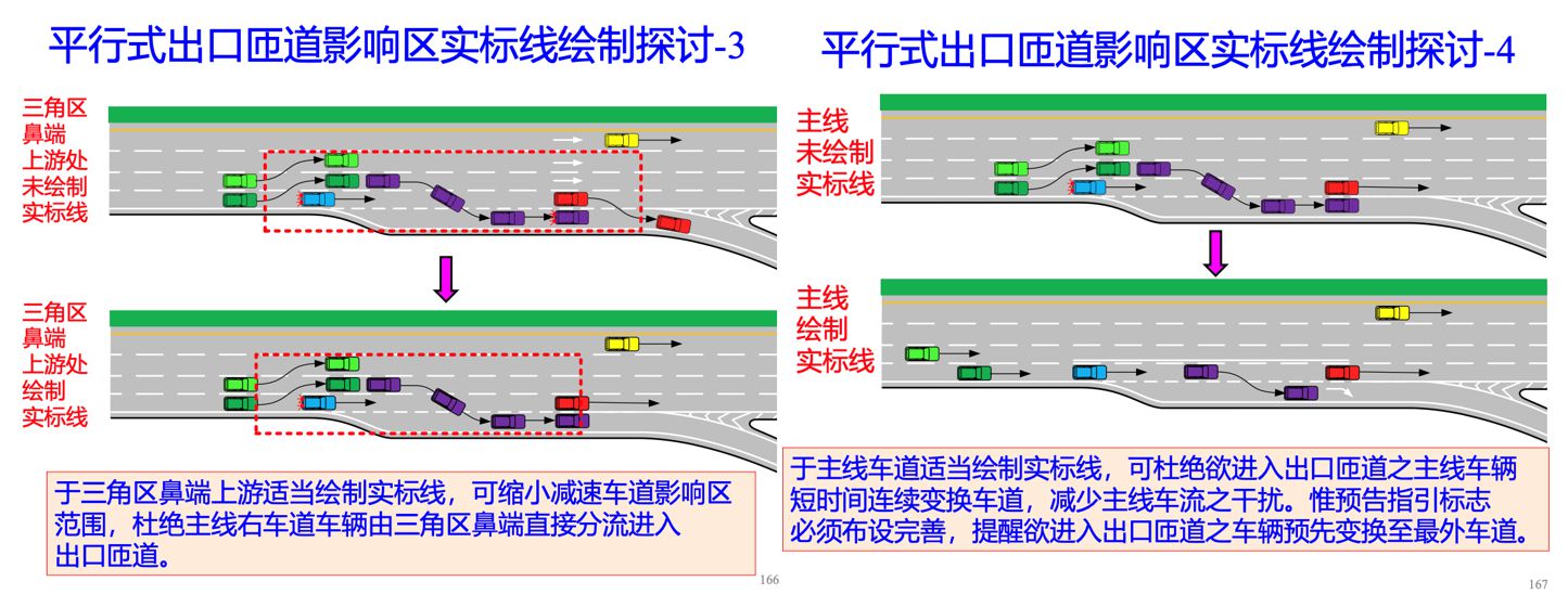 平行式出口匝道影响区的实标线可以有效减少换道扰流与速度纷扰的影响。于三角区鼻端上游适当绘制实标线,可缩小减速车道影响区范围,杜绝主线右车道车辆由三角区鼻端直接分流进入出口匝道。于主线车道适当绘制实标线,可杜绝即将进入出口匝道的主线车辆短时间连续变换车道,减少主线车流的干扰,采取这一措施的前提是预告指引标志必须布设完善,提醒即将进入出口匝道的车辆预先变换至最外车道(图50)。