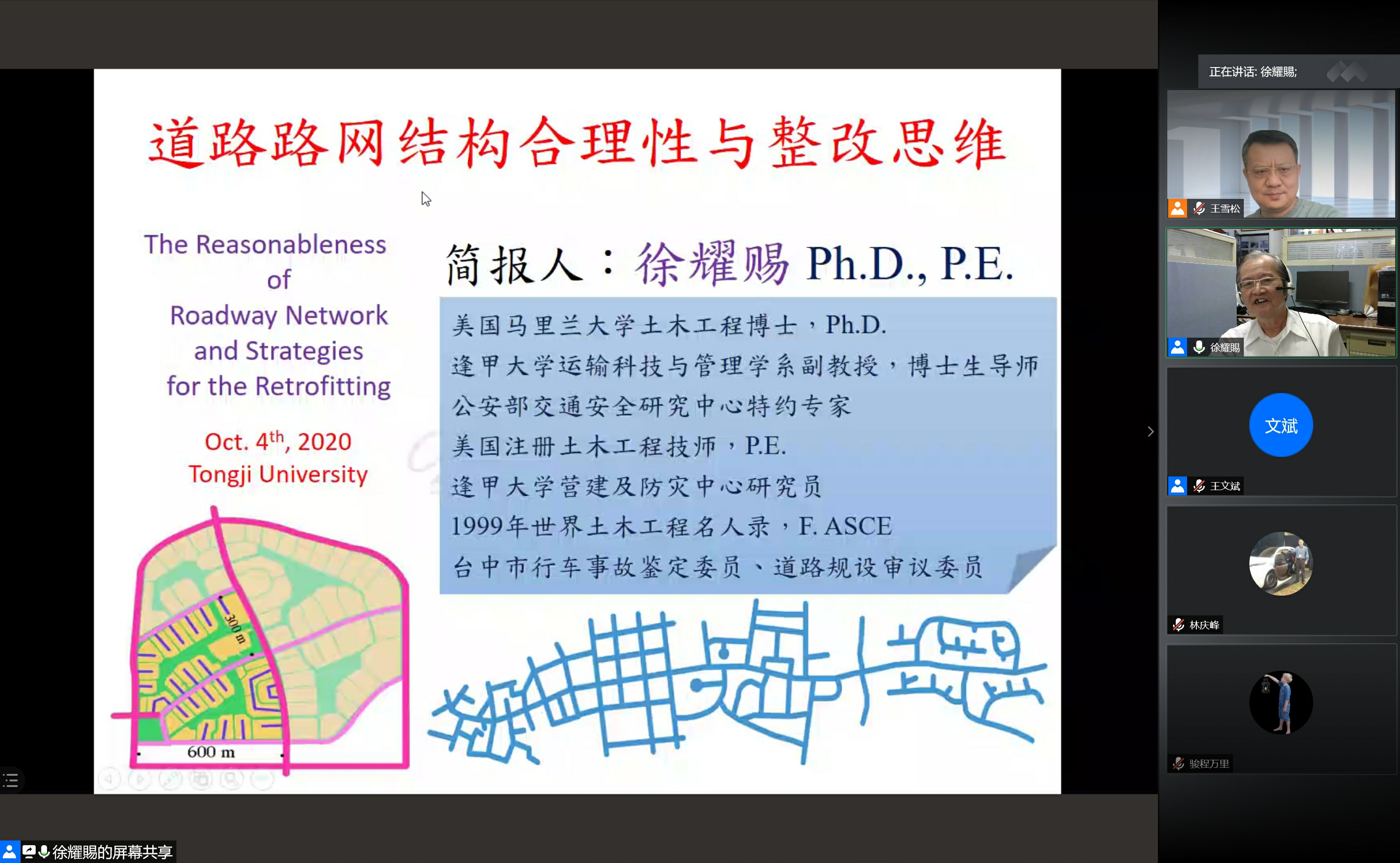 2020年10月4日,同济大学、上海市交通工程学会、公安部交通管理科学研究所、交通运输部公路科学研究院、“一带一路”国际交通联盟(BRITA)、中国公路学报联合举办了第八期“同路人”交通安全技术论坛,本期论坛采用“线上”会议的模式,以“道路路网结构合理性与整改思维”为主题,邀请台湾逢甲大学徐耀赐教授做专题报告。