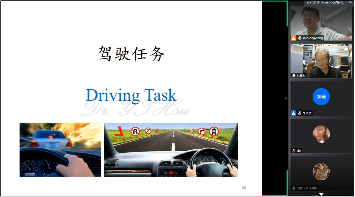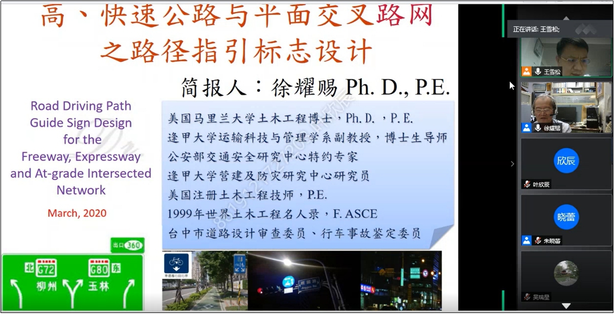 徐耀赐教授分别在6月13日、6月20日,7月11日以“人因与道路工程设计Ⅰ”、“人因与道路工程设计Ⅱ”、“高、快速公路与平面交叉路网之路径指引标志设计”为议题做了系列报告。徐教授从人因理论、驾驶任务等基本概念出发,剖析了驾驶人的感知与反应过程、驾驶人对外界信息的专注程度,驾驶过程中驾驶人面临的驾驶任务等内容,引出了道路几何线形、交通信号灯控制、交通标志标线、自然光线、交通信息负荷与人之间的关系。最后以高、快速道路的路径指引标志设计为实例,从路径指引的意义、人因问题的考虑,路径指引系统的构建、标志布设点位的确定等方面完整的呈现了人因与道路工程设计之间的关系。
