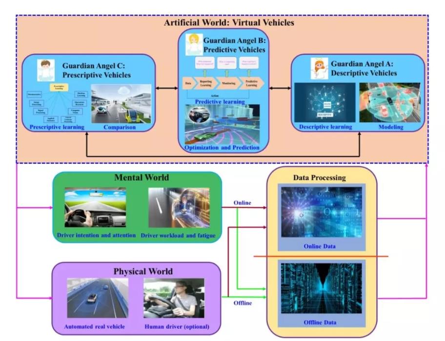中科院自动化研究所复杂系统管理与控制国家重点实验室主任王飞跃教授的平行驾驶理念与CPSS (Cyber-Physical-Social Systems) 研究框架,从理论到实践都是独树一帜的。面向CPSS的平行驾驶通过对物理车辆和真实道路建模,让物理的汽车和软件定义的汽车在真实世界和人工世界平行学习和控制,在物理信号之外还引入了驾驶员的社会情感信号和人机因素。其团队关于平行驾驶智能测试的文章 “Parallel testing of vehicle intelligence via virtual-real interaction”,最近作为 “Focus Article”在今年的Science Robotics发表,得到了广泛关注。