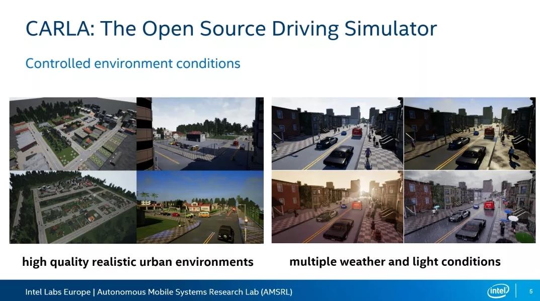 CARLA是英特尔研究院支持开发的开源项目,是英特尔对自动驾驶研究社区的一份贡献。CARLA模拟器基于UE4 物理引擎开发,功能非常强大。它自带多个虚拟城市地图,能模拟输出摄像头、激光雷达、卫星定位等多种传感器数据,并提供视觉深度、车辆速度、3D对象检测、语义分割、碰撞与违规信息的参考真值(Ground Truth)。此外,它还具有场景仿真的能力,能与ROS协同仿真。CARLA给用户提供可扩展的Python API接口,易于上手使用。(关于CARLA的更多详细信息,请登陆 http://carla.org)