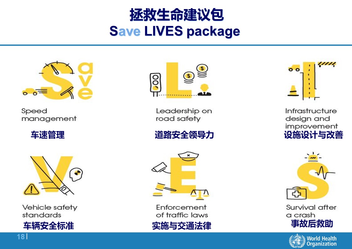 世界卫生组织驻华代表处方丹女士指出联合国制定的可持续发展目标中期望在2020年实现死亡人数减少至60万左右(目前约为125万),并介绍了联合国世卫组织在改善全球道路交通安全方面做出的努力,即安全系统(The Safe Systems Approach)、道路安全5大支柱(5 pillars of the Global Plan for the DoA 2011–2020)和SLIVES拯救生命建议包三个主要概念。