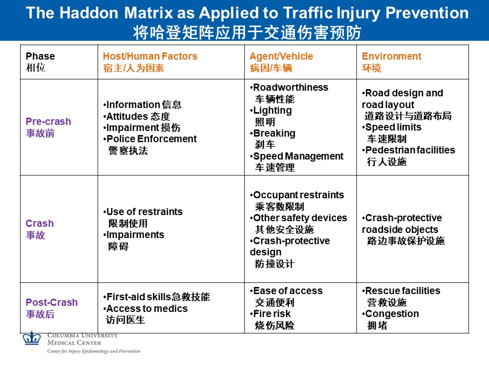 在公共卫生与安全政策专题中,来自美国哥伦比亚大学李国华教授指出,交通事故伤害是1-44岁年龄段人群的主要死亡致因。李教授认为,伤害与事故不同,并不是偶然发生的意外事件;通过安全带、安全气囊等预防措施可以实现伤害的预防和降低。李教授同时使用哈登矩阵阐明了针对交通事故伤害的预防系统构架。