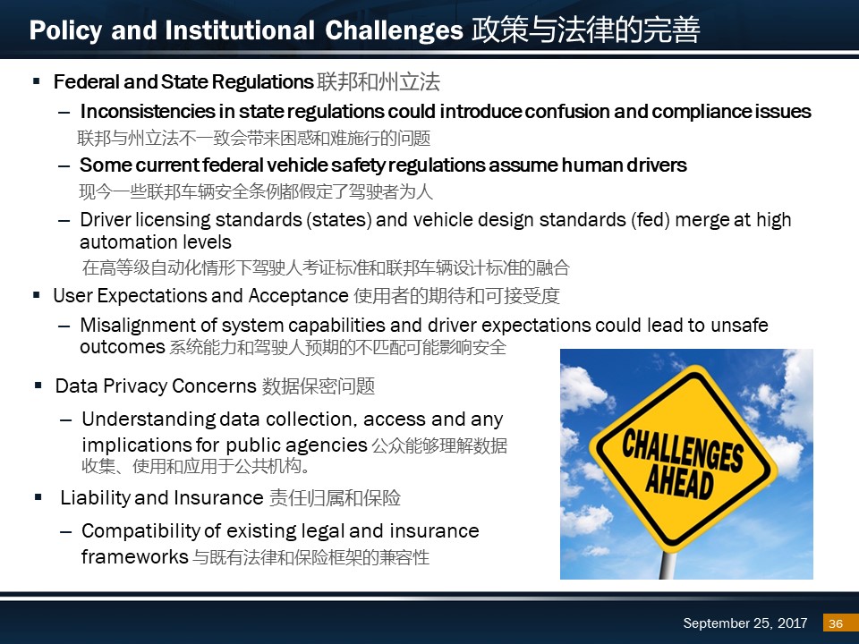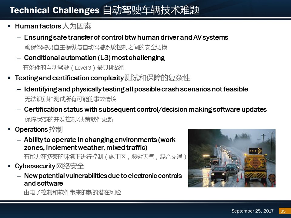 Mohamed Abdel-Aty教授介绍了智能网联自动驾驶车辆技术(Connected and Autonomous Vehicle Technology)的基本内容,分析了其在车-路协同(V2I)、车-车协同(V2V)、车-人协同(V2P*)以及自动车(AV)的安全效益,而后Aty教授以低能见度环境为切入点,详细介绍了其团队针对车联网技术的交通安全改善效果研究成果。美国德克萨斯州交通厅的马建明博士系统介绍了美国联邦政府在自动驾驶领域的立法、政策、试验场运行以及开放道路测试等方面的最新进展:2017年9月美国联邦政府以“安全新愿景”(A Vision for Safety)为主题发布了自动驾驶政策的更新版;联邦公路管理署已开展自动驾驶卡车编组运行应用和自动驾驶环境下交通规划流程相关研究。