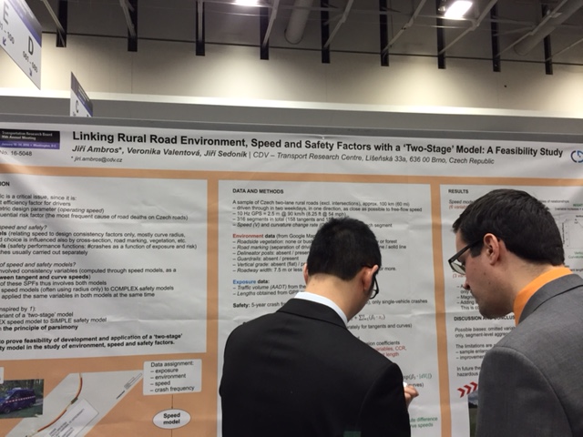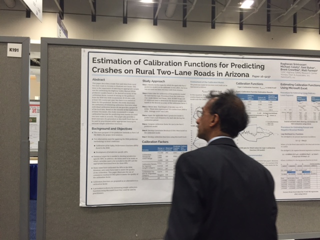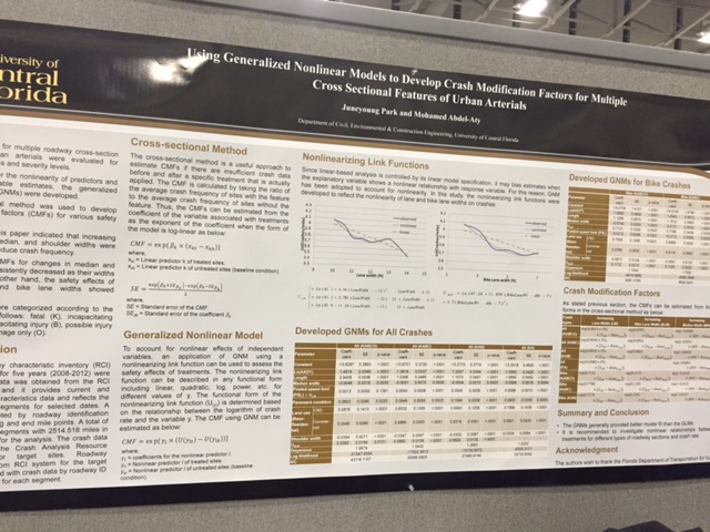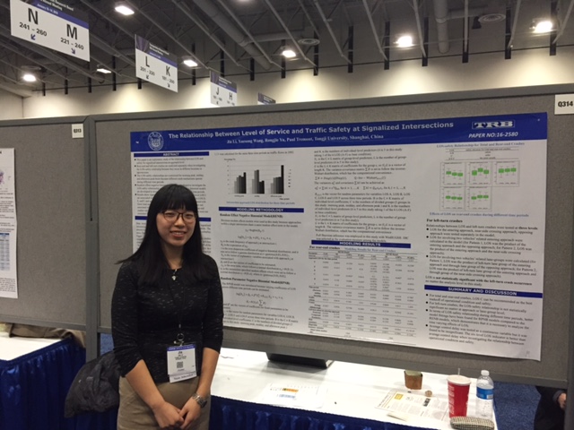 作者:李佳 参会论文:The relationship between level of service and traffic safety at signalized intersections 在学院及导师的支持下,终于在2016年1月10日完成了自己在学术道路上的一个小小梦想—参加世界交通年会TRB,展示了自己的学术论文,并感悟了交通领域大牛,学者,学生的研究。既感受到了小小的荣誉,又感受到了大大的压力。 TRB会议涵盖领域750个会议,在老师的指导下,针对自己的博士论文开题方向,有针对性地就以下几个议题进行了参展开会与学习。 2016年1月10日开始参加TRB会议。第一天主要是workshop,主要关注了HSM更新。并结合目前交流的中佛罗里达大学所做项目,目前HSM更新主要考虑以下几个方面:a) 目前HSM中的Safety Performance Function(SPF)根据两个州的数据估计,适用性有待检验,因而下一步考虑采用多个州的数据来建立SPF以提高手册的适用性;b) 进一步增加freeway设施的安全评估;c) 加强对道路设计参数对道路安全的影响评估,即Calibration Modification Factor(CMF)的精确估计。 回奥兰多后继续与组内的学生讨论目前的NCHRP的项目是如何更新HSM,目前了解到了以下几个方面:a) 新一轮的研究中用三个州的数据增加模型的迁移性;b) 目前的HSM中各类型的事故都是根据总事故数乘以比例来计算,而新版的手册对不同事故类型的事故建模,这样更精确。 a) 各地SPF的建立目前均是按照HSM的步骤进行模仿;b)针对HSM中CMF的估计,采用横截面法或者Before-after的方法更新HSM中已有或没有的参数;c) 做模型transfer的论文这次只看到了一篇,即UCF的论文,用三个州的rural segment数据做模型然后评估该模型对三个州的适用性;d) 关注速度与事故的关系,目前大多数速度与事故关系的研究依然是根据线圈检测数据,其中有一篇研究类似于组内同学的研究,题目为:Linking Rural Road Environment, Speed and Safety Factors with a “Two-Stage” Model: A Feasibility Study,采用FCD数据来获得道路的速度参数,但是只有一辆车的数据,上海市浮动车数据依然是一个比较好的选择。 SPF海报论文展示 CMF论文海报展示 速度与安全关系论文海报展示 1月12日下午2:00-3:45,在海报展厅展示自己论文期间,有不少老师及学生前来探讨,以下几点很有启发:a)如何评估服务水平和流量之间的相关性,在分析数据时检验过两者之间的相关性,因为低于0.5,故将两者放在了一起;b)关于本文的工程意义,探究的事服务水平与安全的关系,对于工程上的指导,首先针对总事故和追尾事故,在得知服务水平的情况下可以分析安全水平,同时可以通过采取措施提高服务水平来提高安全水平,如果下一步可以做安全效应的研究,即服务水平的提升可以降低多少事故,会更有意义;c)关于左转事故的结论,也有一些交流的老师提出,左转事故很多是与驾驶员闯红灯行为有关,因而与交通流的服务水平相关性不太大。 自我论文海报展示 二、华盛顿参观之我见 从九月份至今在佛罗里达州的奥兰多交流,这次从小镇来到大城市的市区,第一次乘坐了美国的地铁,公交,并且住在了市区。感受到了与小镇一样的蓝天白云,看到了不一样的大城市市区的繁华,中国城的热闹;体验了公共交通系统信息服务的发达,也感受到了发达国家公共交通设施的陈旧;看到了与小镇不同的急促的闯红灯的城市行人,也感受到了与小镇一样的礼貌让行的机动车;体验到了逢交叉口必停车的晚高峰,也感悟到密集的方格路网带来的堵而不死。 感谢学院及导师满足我小小的心愿,参加了TRB年度会议,与众多的交通学者进行交流,增长了见识,感受到了压力。接下来的时间里,将再接再厉,2017年TRB再见。一、学术交流之我见