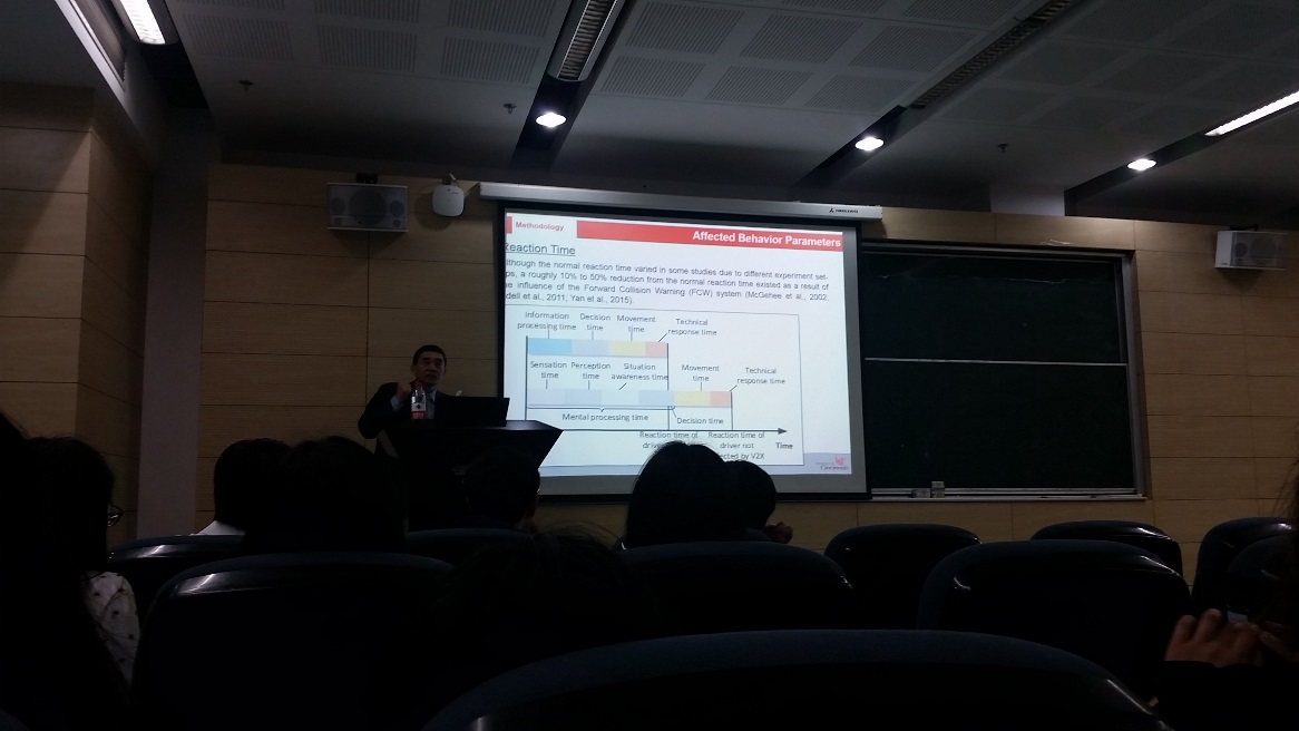 5月11日下午魏恒教授在交通运输工程学院进行了以 ”Synthesis on Traffic Impact of Connected Vehicle: Operation, Safety and Environmental Perspectives” (车联网环境之:运行、安全与环境方面的考量)为主题的讲座。讲座就车辆运行、交通安全及环境方面为车联网发展带来的挑战,如何在车联网发展的大趋势下,考虑这三者因素进行了介绍。