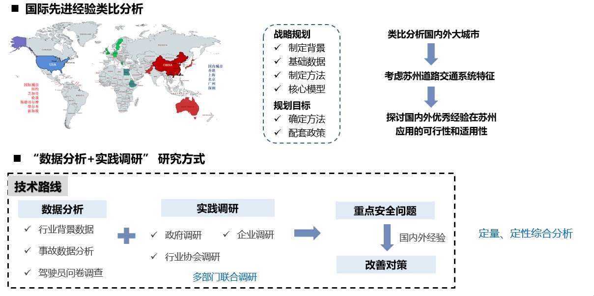 项目采用“数据分析+实践调研”的技术路线,通过对行业背景数据、事故数据,调查问卷进行分析,对政府、企业、行业协会等开展调研,剖析出苏州市目前在道路交通安全方面存在的重点安全问题,同步将苏州与国内外的大城市进行类比,探讨国内外优秀经验在苏州应用的可行性和适用性,最终提出苏州市道路交通管理的改善对策。