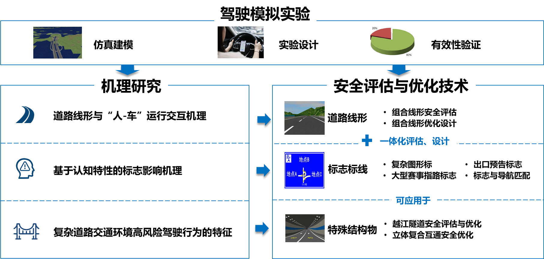 针对复杂道路交通环境的安全评估与优化,创建了基于驾驶模拟的道路组合线形、标志标线、重大工程与特殊道路设计安全评估与优化技术。