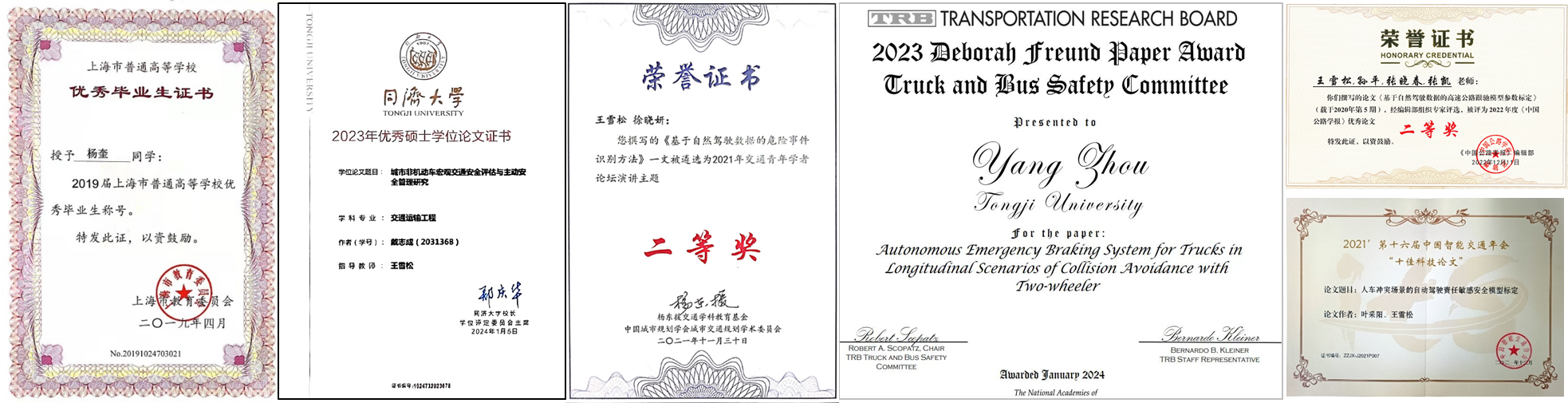 指导的毕业生中,10位学生获国家研究生奖学金,6位获上海市优秀毕业生,5位获同济大学优秀毕业生,3位获同济大学优秀毕业论文。多名学生获2023年TRBBest Paper、中国公路学报优秀论文、中国智能交通年会“十佳科技论文”等荣誉。