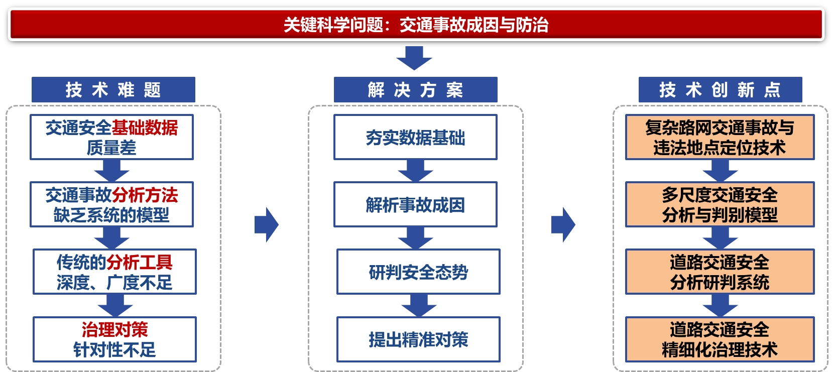 聚焦“交通事故成因与防治”关键科学问题,面对交通安全基础数据质量差、交通事故分析方法缺乏系统的模型、传统的分析工具深度、广度不足、治理对策针对性不足的问题,形成了“基础数据-分析方法-分析工具-治理对策”系统的交通安全综合治理方案。实现以下技术创新: