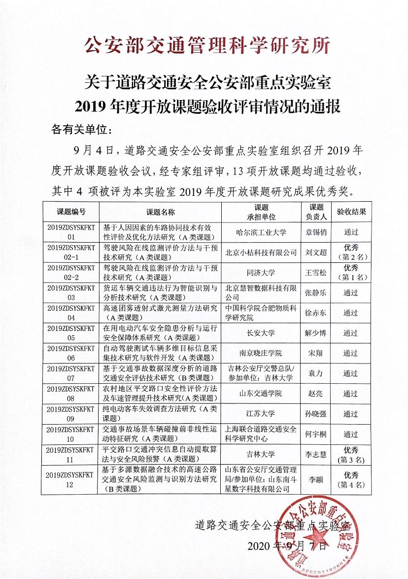 经专家组评定,“驾驶风险在线监测评价方法与干预技术研究”通过验收,并评为道路交通安全公安部重点实验室2019年度开放课题研究成果优秀奖(第1名)。