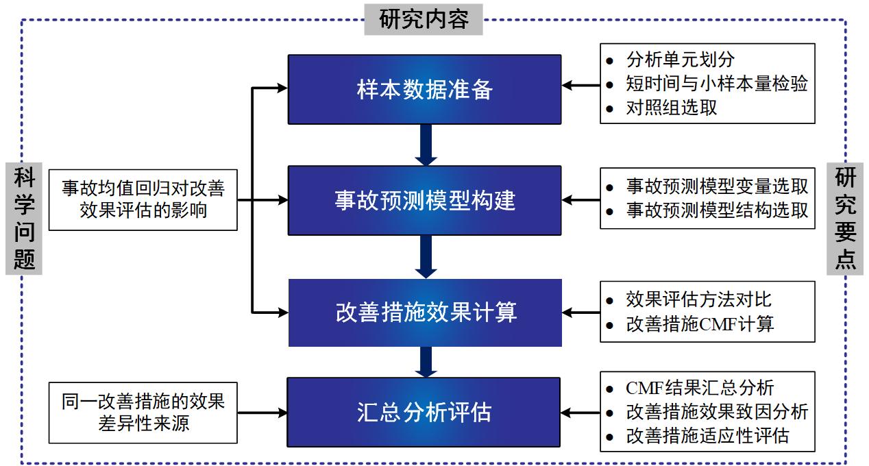 交通事故多发道路改善效果评估研究个方面进行展开:(1)准备样本数据;(2)构建事故预测模型;(3)计算改善措施效果;(4分析改善措施适应性形成了“数据准备-事故预测-效果评估-适应分析”的交通事故多发道路改善效果评估标准化流程方法,初步构建了信控交叉口、城市主干道、城郊主干道及高速公路四类典型道路设施国内改善措施事故修正系数库。