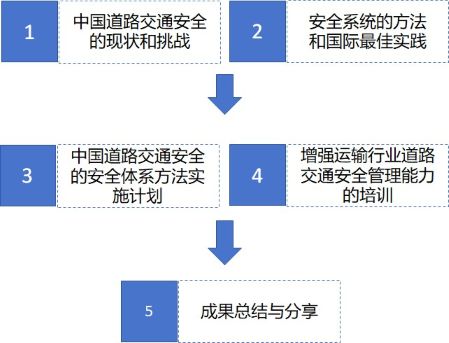 图1 安全系统方法重点关注的五大方面 本项目共三项研究任务,包括制定中国道路交通安全“安全系统”方法的实施计划、增强运输行业道路交通安全管理能力、提高对安全系统和运输行业安全的认识。研究团队依托“安全系统方法”的原则,从现状和挑战、国际最佳实践、实施计划、行业管理能力培训等四个方面开展了工作。 u 现状和挑战:从安全系统的五大方面梳理了中国道路交通安全的现状和挑战; u 国际最佳实践:梳理了安全系统方法与传统方法的差异,总结了安全系统方法的国际最佳实践; u 实施计划:采用“数据分析+实践调研”的技术路线,制定了中国道路交通安全“安全系统”方法的实施计划; u 行业管理能力培训:针对在中国实施安全系统方法,设计了6个培训专题,开展了8场次培训。 图2 项目技术路线 项目研究成果包括中、英文技术报告共计12份。内容覆盖了安全系统方法的差距分析、实施计划、方法手册、营运车辆安全管理基准报告及交通部关于改善商用车辆安全管理的行动计划,总结了道路交通安全管理、道路设施安全、运输企业安全、车辆安全、安全教育、医疗救助等方面的安全现状与提升对策。研究成果对在中国实施道路交通安全系统方法有借鉴作用。