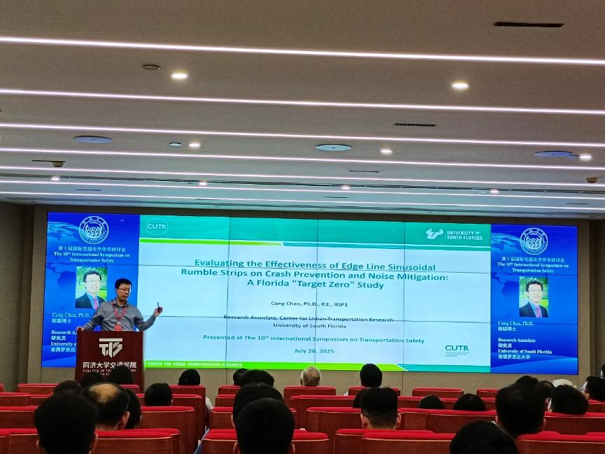 南佛罗里达大学陈聪研究员围绕“标线边缘正弦型隆声带对交通事故预防和降噪的效果评估:美国佛罗里达州‘零死亡愿景’研究”发表演讲,介绍了一种新型的听觉震动处理改善措施——正弦波减速带,并评估了其在解决外部噪音问题及降低车道偏离事故的效果。