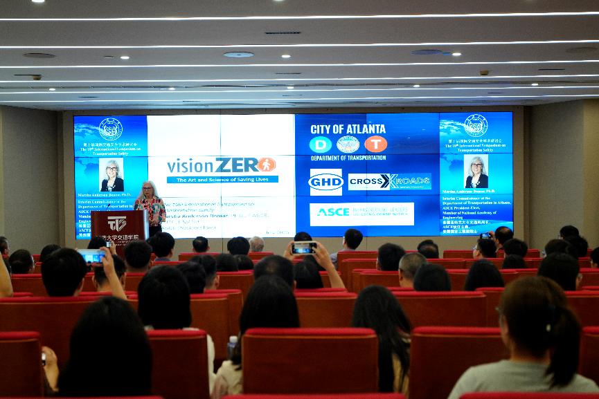 美国亚特兰大市交通局局长、ASCE候任主席、美国国家工程院院士MarshaAndersonBomar围绕“通过零死亡愿景项目推动交通安全优先发展”,介绍了“零死亡愿景”的交通安全理念,探讨多个实施措施与政策的城市案例并分析其有效性,介绍了实现“零愿景”目标需要完成的工作,包括行人信号控制,非机动车防护设施,以及学校区域限速策略等安全措施与政策。